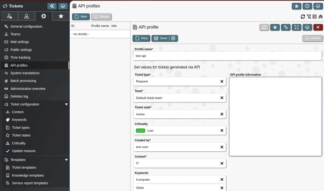 Der API User ist einem Ticketteam zugewiesen...